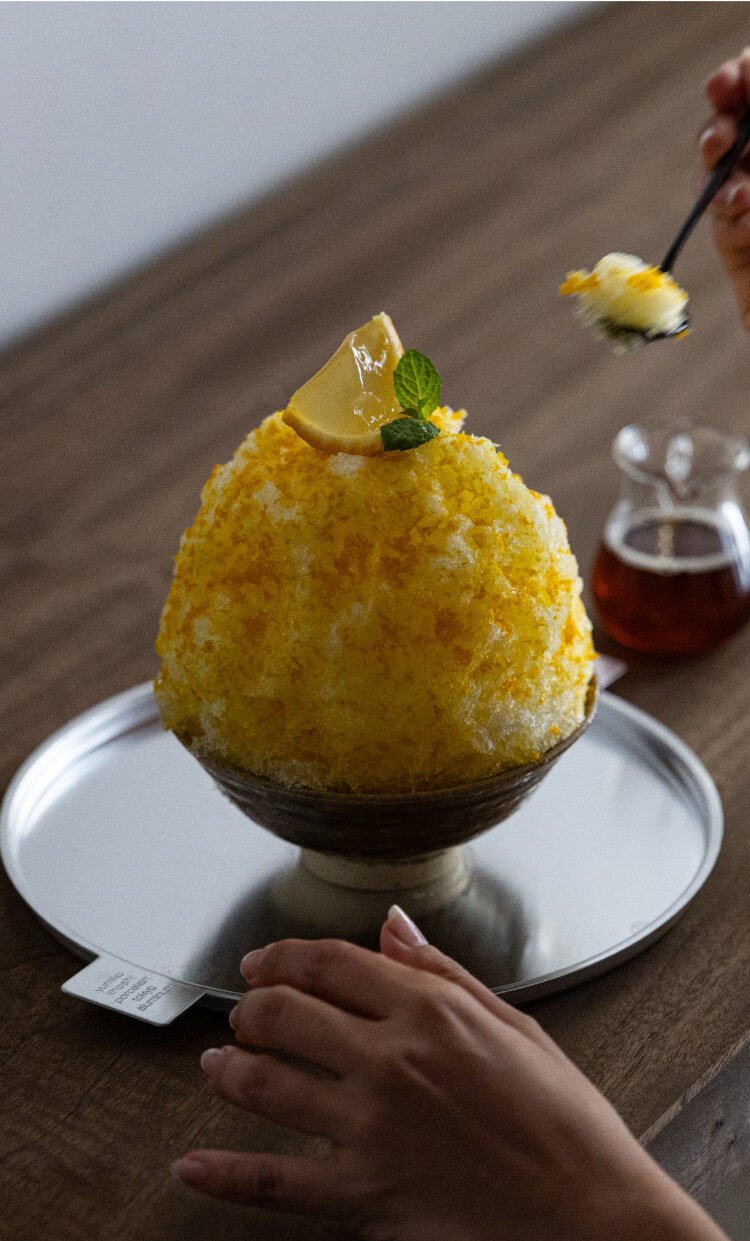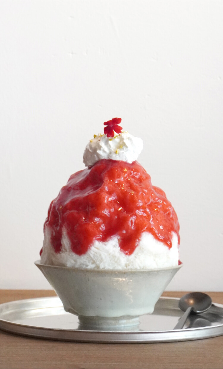 かき氷を盛りつけるのは、唐津焼の陶芸家たちによる手仕事の器。自然から生み出された風合いが、果実の色彩と氷の透明感を美しく引き立てます。